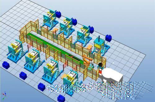 此生產線與布局1相似,由兩臺澆注機器人和兩條軌道系統組成,澆鑄機分布在軌道兩邊,一臺澆注機器人負責一邊的鑄機。澆注機器人接受到鑄機的澆注指令,澆注機器人從熔爐勺取定量的鋁液,然后通過軌道運動到鑄機旁,進行自動澆注,由于兩臺機器人共用一臺熔爐,之間會有一個信號集成。