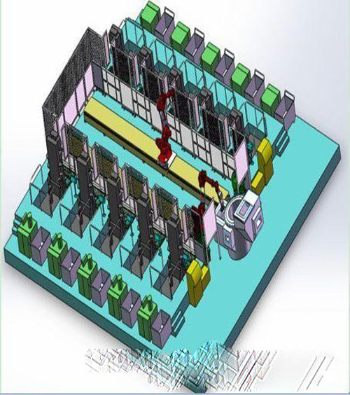 e.取件機器人放入傳送帶,檢測機器人對傳送來的零件進行檢測和X射線探傷,檢測機器人將不合格取出放置在不合格品區。從傳送帶流轉過來的合格產品通過取件機器人放置在熱處理區域。