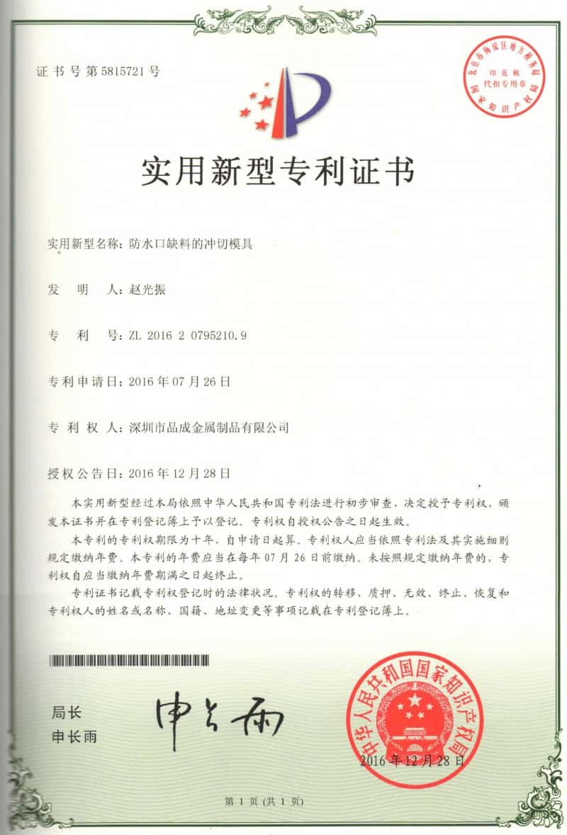 導語: 2016年11月,我司自主研發的兩項實用新型專利——“防水口缺料的沖切模具”、“高性能壓鑄模具”,被國家知識產權局正式授權。2017年1月,正式收到此兩項實用新型專利證書。