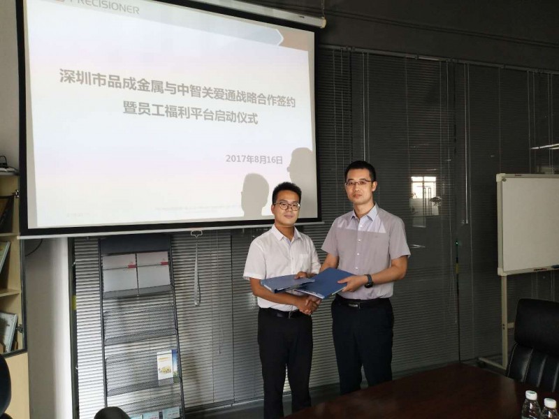 2017年8月16日,深圳市品成金屬制品有限公司(以下簡稱,品成金屬)與中智關愛通(上海)科技股份有限公司(以下簡稱,關愛通)簽署戰略合作協議,雙方將共同搭建專屬品成金屬的員工關愛平臺。
