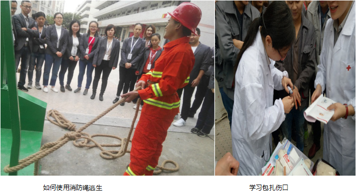 此外,公司還安排了學習消防知識和使用消防器材的環節。學習內容包括如何報警、如何使用滅火器、如何使用消防栓及消防水帶、如何使用消防繩逃生、如何急救等。其中滅火器及消防水帶使用外請園區安全防護工作人員指導完成。全體人員分四個小組輪流學習,并積極主動體驗實際操作。