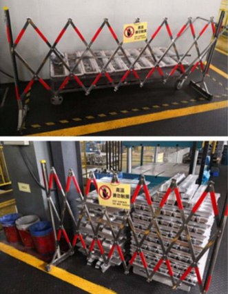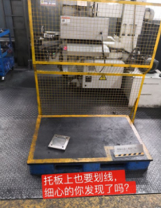 在機械設備周邊的手工作業區,配備防護網,預防設備帶來的機械傷害。再仔細看看!托板上都有劃線,放置區域功能說明、所屬單位指示牌。