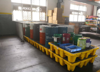 在廢油廢鐵渣區,用帶有黃色警示標志的防泄漏托盤承放油桶,目的就是防止桶內油傾倒或溢出造成對環境的污染,這種防二次泄漏的擺放方式能更安全。