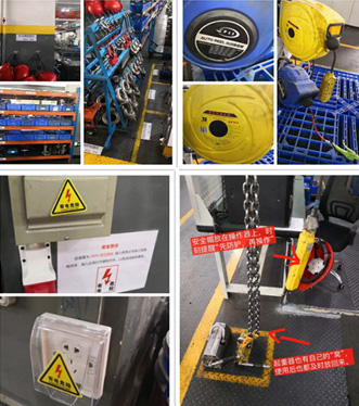 工具都有自己的家。現場使用的風槍管道加裝了自動卷管器、線路板加裝自動伸縮排插,閑時可以自動回收線路,降低員工被管線絆腳導致事故的風險,也保證車間的整潔、美觀。儀器設備專用的380V電路線路設置安全警示告知書,同時在閑置插線板上加裝絕緣防護罩,同時配備“有電危險”的警示標識。