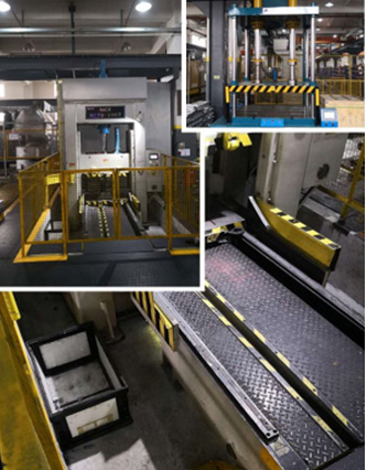 存在機械傷害風險的機械設備,在周邊增加了防護欄,同時防護欄以通體"黃色"增加員工的視覺沖擊,在機械設備的高風險位置也增加了黃色斑馬線起到特別警示作用。