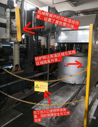 剛出爐的鑄件、工具等殘留極高的溫度,我們在這個區域配備了可折疊式的防護網,可以根據實際情況實時調整需要警示的方式與位置。