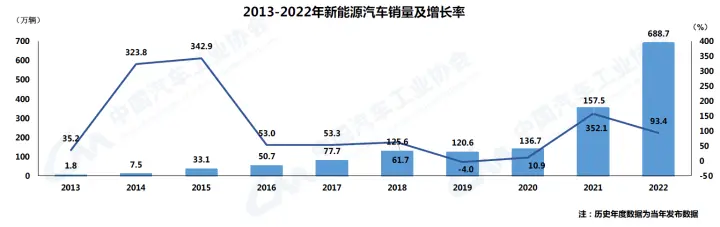 中國汽車工業協會最新統計顯示,2022年我國新能源汽車持續爆發式增長,產銷分別完成705.8萬輛和688.7萬輛,同比分別增長96.9%和93.4%,連續8年保持全球第一。