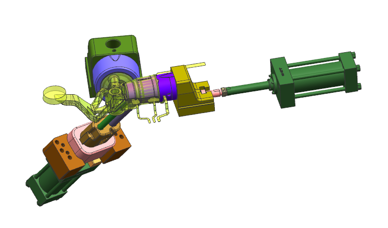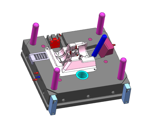 模具上斜行位位置放置鋼預埋件壓鑄及后模大角度斜滑塊